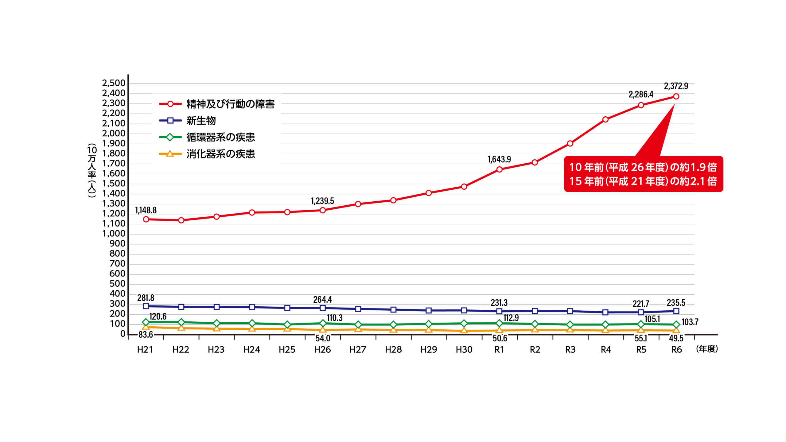<図1>主な疾病分類別長期病休者数(10万人率)の推移