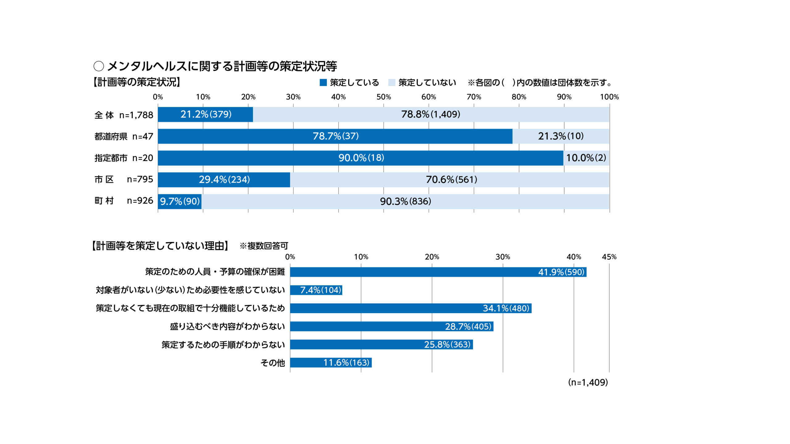 地方公務員安全衛生推進協会が毎年実施している「地方公務員の健康状況等の現況調査」によると、令和6年度における精神及び行動の障害による長期病休者率(10 万人率)の推移は、前年から増加して2,372.9人で、15 年前(平成 21 年度)の約 2.1 倍であった(図1)。一方で、自治体のメンタルヘルスに関する計画の策定状況は、わずか2割程度にとどまる(策定済みの自治体:379、未策定の自治体:1,409)。理由には、「策定のための人員・予算の確保が困難」が一番に挙げられるが、他にも「取り組むべき内容がわからない」「策定するための手順がわからない」などがある(図2)。事前にメンタルヘルス対策の運用方法が決まっていないケースに加え、運用方法が決まっていても、復職支援がうまくいかず休職を繰り返す職員の対応に追われている自治体も多くあるのではないだろうか。