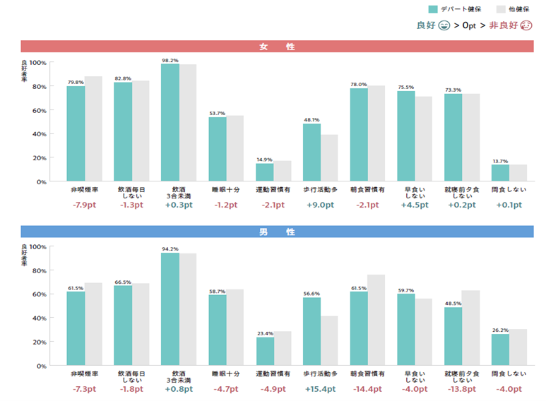 D健保では、循環器系および内分泌系の医療費の高さが顕著であり、特定健康診査・特定保健指導の実施に注力してきました。その中で、被保険者の業務特性やライフステージを考慮した睡眠のセルフケア力の向上と、専門職による個別性のある支援が課題と感じています。まず、小売業では、早朝準備や閉店後対応、繁忙期の長時間勤務等、不規則な勤務が構造的に生じやすく、睡眠を含め生活リズムが乱れやすい傾向があります。他健保との比較において、特に男性では「睡眠時間が不十分」「朝食を食べない」「夕食が遅い」割合が高い状況です(図2)。その結果、起床時の疲労感や日中の眠気といった症状を訴える方もいます。また、更年期にある女性では、不眠の悩みを抱えながらも、本人が更年期特有の体調変化に起因している可能性に気付かず、我慢し続けていることも少なくありません。