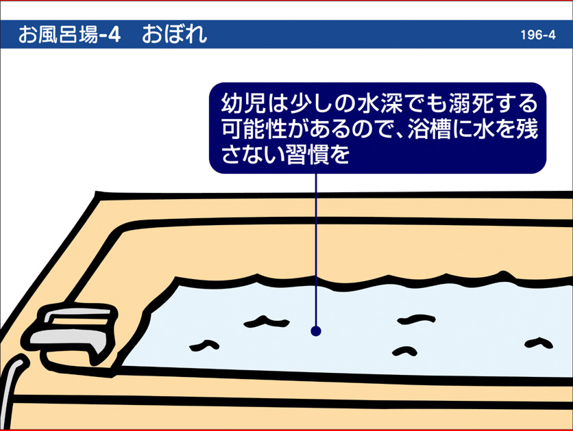 乳幼児のおぼれは死につながる事もあり非常に危険です。昼間は浴槽にお湯を残さないようにします。